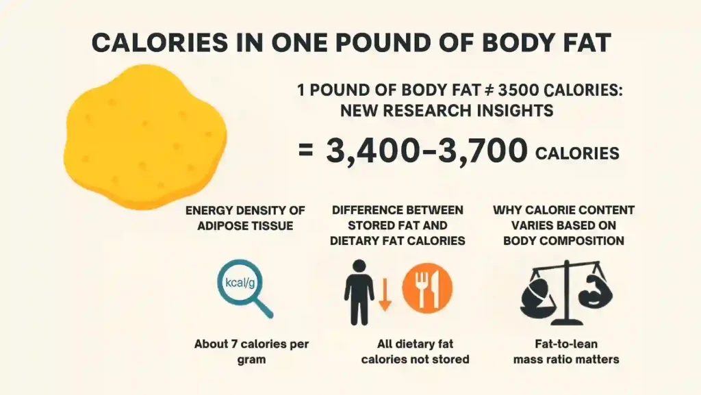 One pound of typical human body fat contains about 3,500 calories as a rough guide, but the real number varies with tissue mix and individual factors. You can use 3,500 as a simple rule. Expect differences when you apply it to your body.