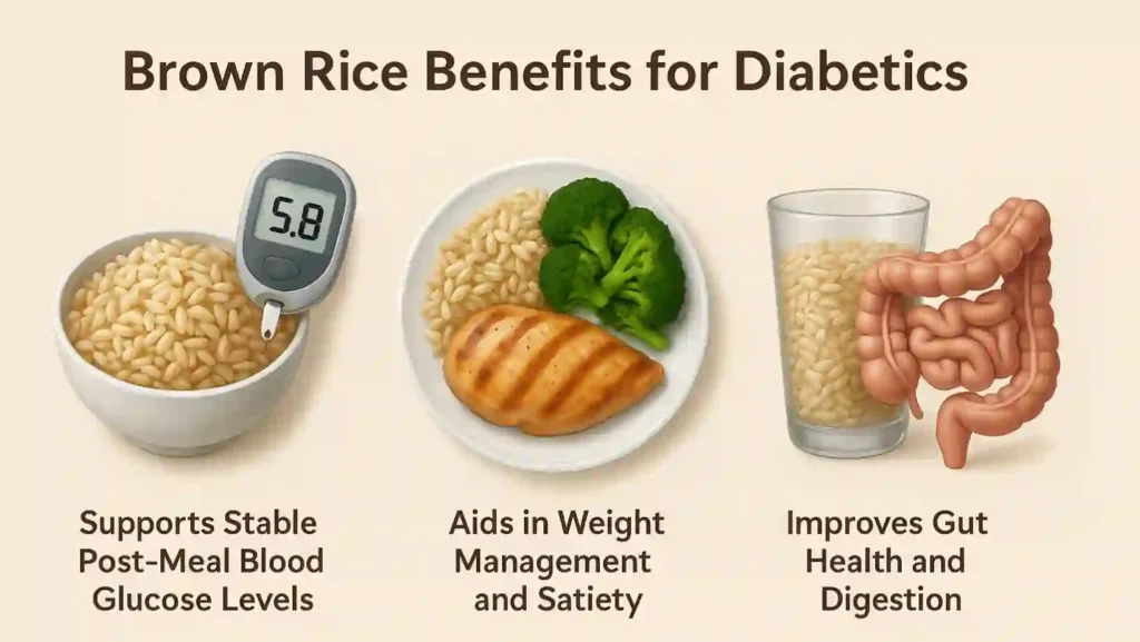 Fiber in brown rice increases fullness after a meal. Feeling full helps you eat less later. Lower calorie intake can support weight loss. Weight loss often improves blood sugar control. That is one reason brown rice for diabetes helps indirectly with glucose management.